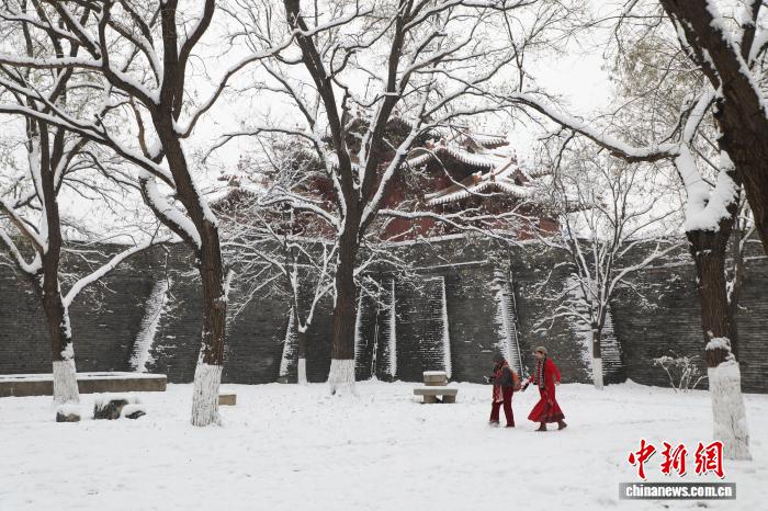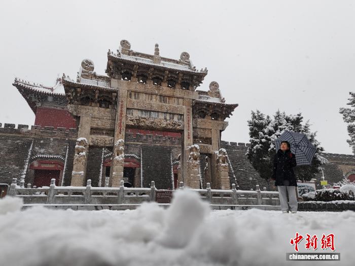 12月13日,山东泰安,岱庙银拆素裹,黑雪笼罩青瓦飞檐,白墙映雪,吸收旅客容身鉴赏。旧阳 摄